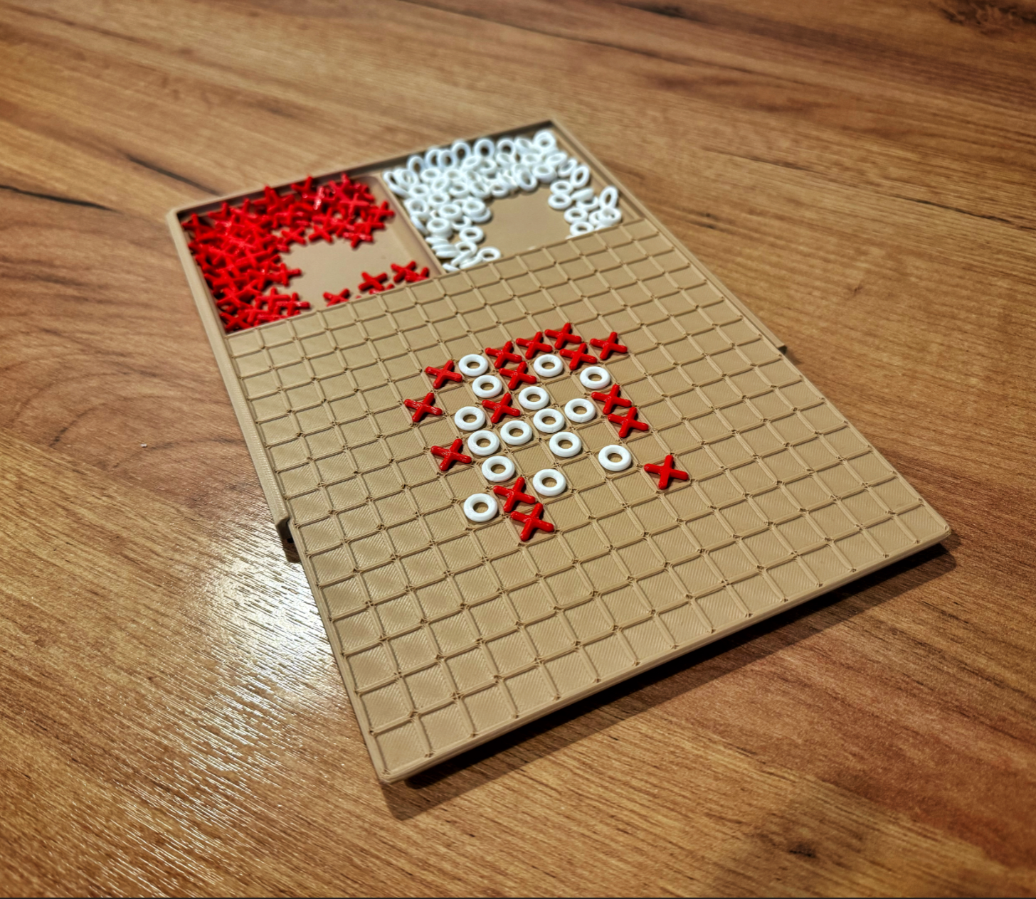 Take classic Tic Tac Toe to the next level with this extended 15×15 grid strategy edition! This 3D-printed board features a large playing field, perfectly crafted X and O pieces, and built-in trays to keep everything organized.
