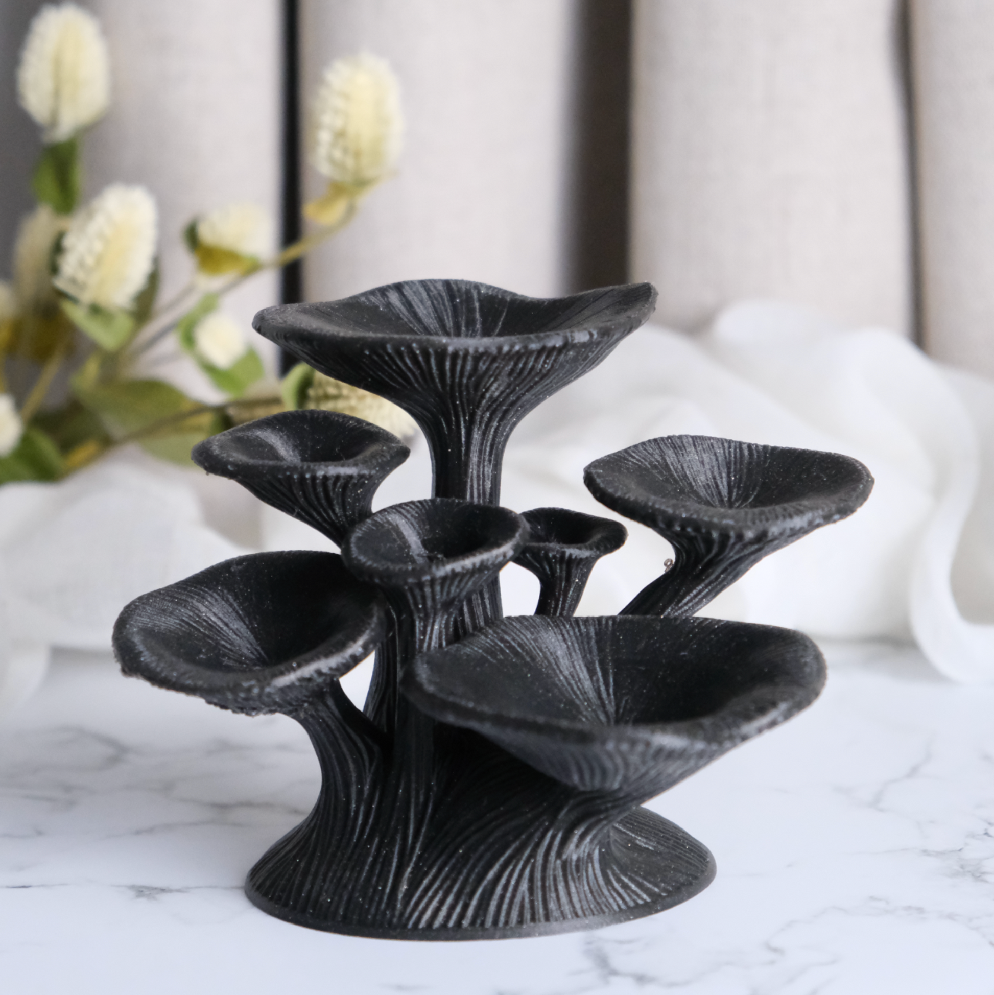 The Mystic Mushroom Jewelry Holder brings together nature-inspired artistry and functional design. Shaped like a cluster of graceful mushrooms, each cap forms a convenient dish for rings, earrings, and other small accessories. With its flowing textures and intricate details, it doubles as a practical organizer and a striking decorative piece.